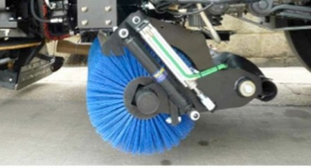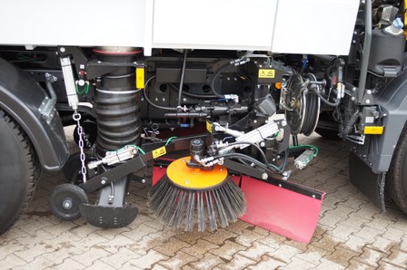 Der Seitenbesen ist ebenfalls gezogen aufgehangen und kann sowohl eingefahren in der Kontur des Fahrzeugs kehren als auch ausgefahren arbeiten. Im ausgefahrenen Zustand gibt er bei Kontakt, z.B. an Rinnen, nach und folgt den Konturen.