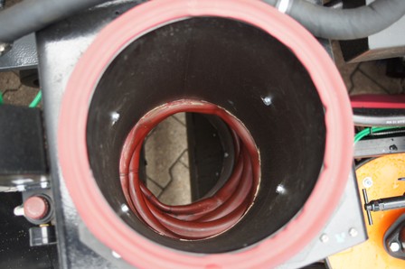 Der Scarab Saugschacht ist immer gezogen aufgehangen und wird von 2 Gummirädern geführt. Durch Kippen des Saugschachts können Gegenstände wie Flaschen und Dosen oder z.B. größere Mengen Fräsgut oder Laub aufgesaugt werden. Die Aufhängung über eine Kette schützt den Pneumatikzylinder vor Vibrationen und Schlägen.